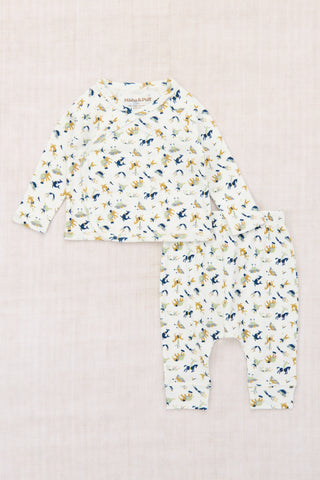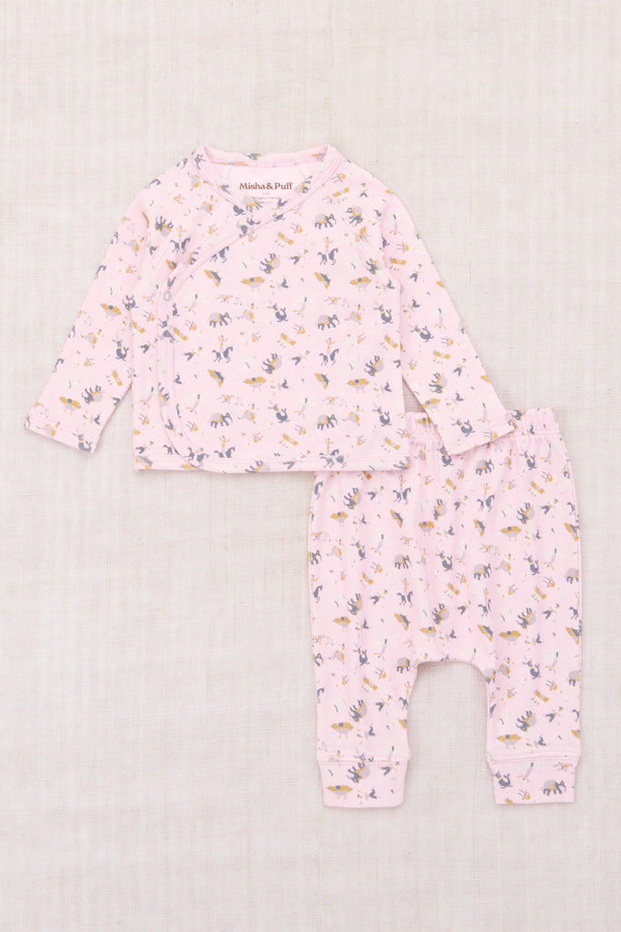 A set in soft organic pima cotton featuring a long-sleeved wrap top with a front snap closure and easy to pull on bottoms.