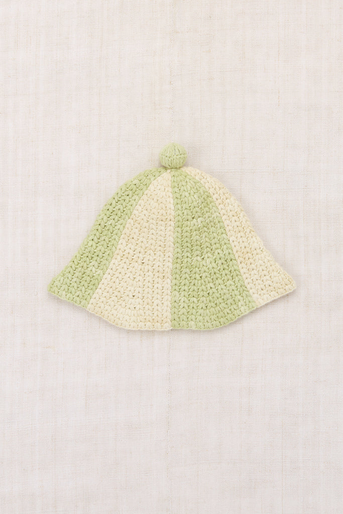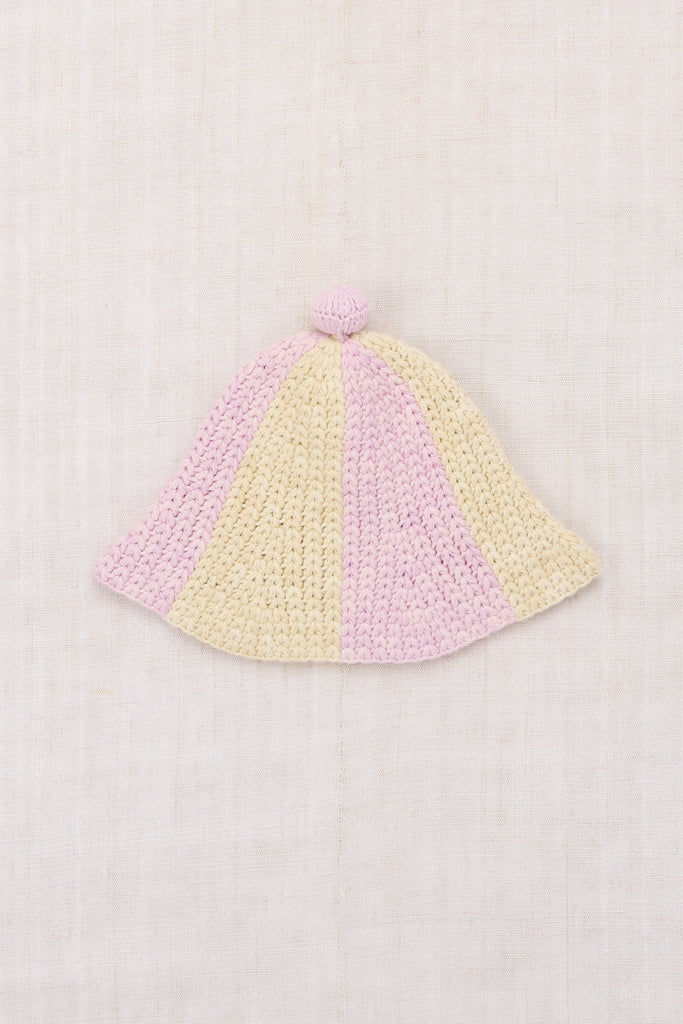 A hand crocheted hat in pima cotton featuring stripes and scallop detail and a pom top.